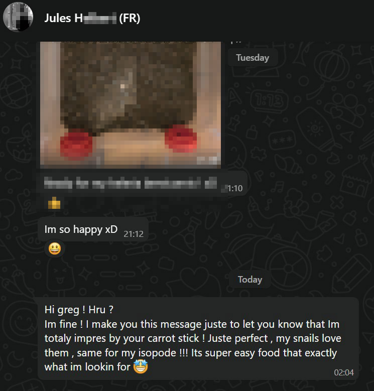 These dried carrot sticks are truly a game changer as a food of choice. We have all had enough with how fast the pieces of vegetables and fruits are getting mold, and the amount of fruit flies that these are producing. These carrot sticks, on the other hand, are 10 times more mold resistant! They are high in fibre content and beta-carotene and all arthropods love it! I have been observing my isopods, millipedes and roaches eating it and loving it, and me having peace of mind and more free time for myself. It is truly a game changer in this field! Some isopods might not eat them, or eat them in the beginning and then stop. But all of my millipedes and roaches are loving it (watch the video below).