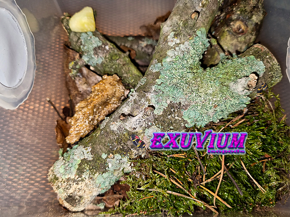 Terrarium: needs to be escape-proof, since Ardentiella isopods – especially the young and mancae – can climb vertically on plastic, like most roaches do. I keep them wetter – like the Cubaris isopods – with a layered setup of decaying leaves, moss, pieces of twigs with lichen and on top cork bark or tree bark. Check out also our premium substrate.