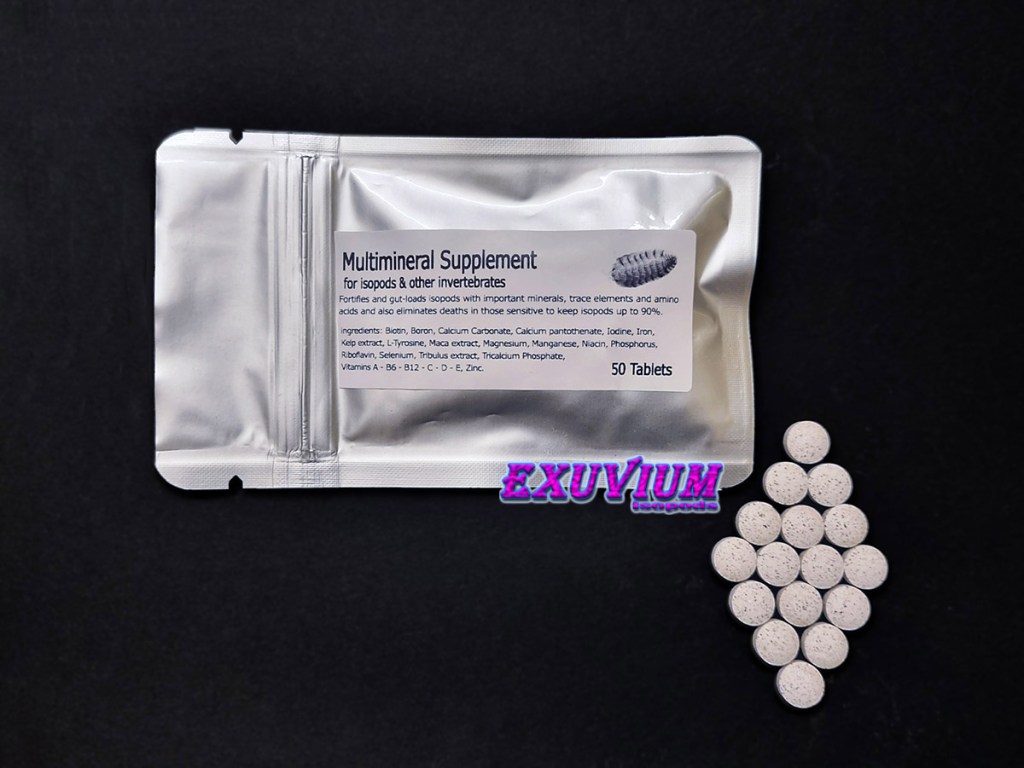 This specialized multi-mineral supplement fortifies and gut-loads isopods with important minerals, trace elements and amino acids and also eliminates deaths in those sensitive to keep isopods up to 90%. I have had personal success with my Porcellio nicklesi ‘Rubivan’ colony where 85% of the isopods died and after I started offering experimentally those multi-mineral tablets I started finally seeing mancae in my colony! Then I tried it also at my Porcellio bolivari ‘Yellow Ghost’ and they also were loving it, their deaths eliminated and their numbers increased! Then it was time to try it on my Porcellio silvestrii colony, where I have had deaths. Needless to say that the positive results repeated once more! Then on my Porcellio haasi ‘High Yellow’ isopods. They were also loving it and they started breeding like crazy! 😀On my Nesodillo arcangelii ‘Shiro Utsuri’, on my Porcellio magnificus, where, again I have experienced the same positive results!