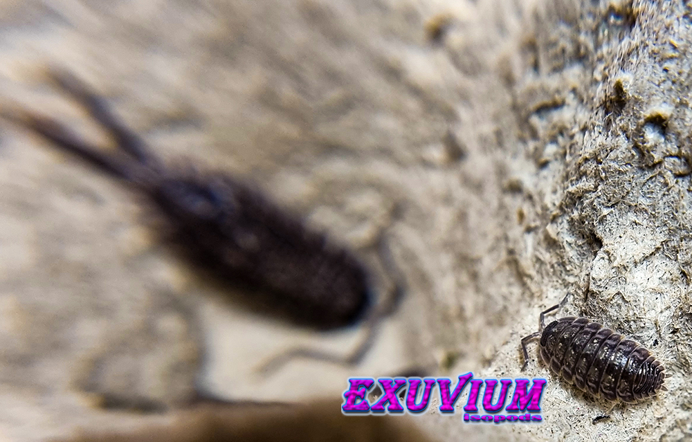 Porcellio nicklesi ‘Dark’ was isolated by a Spanish isopods breeder. It has white spots on a dark grey body.